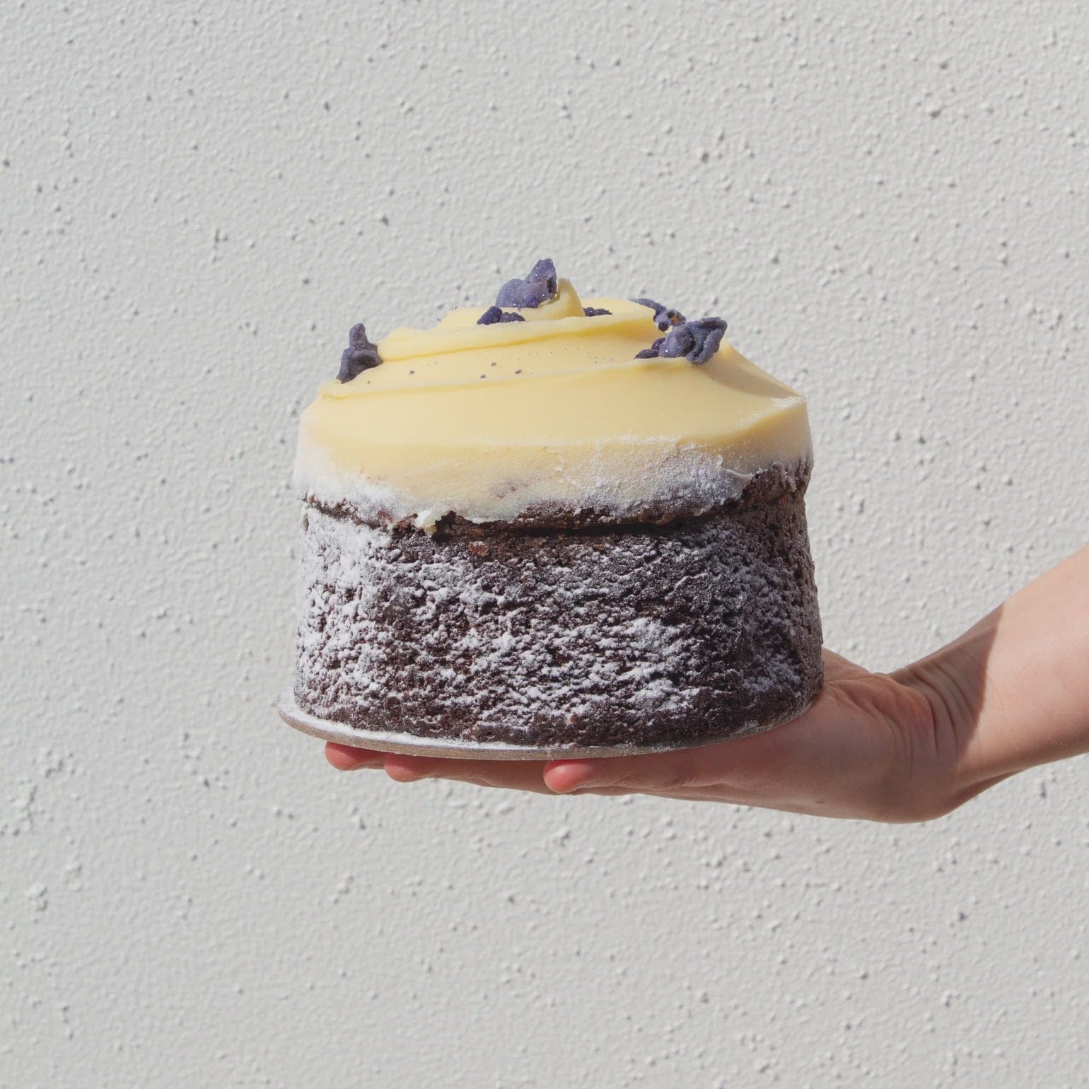 A moist, fine-crumbed chocolate cake made with sour cream, topped with a creamy & sweet white chocolate ganache. Finished with a sprinkling of candied violets.