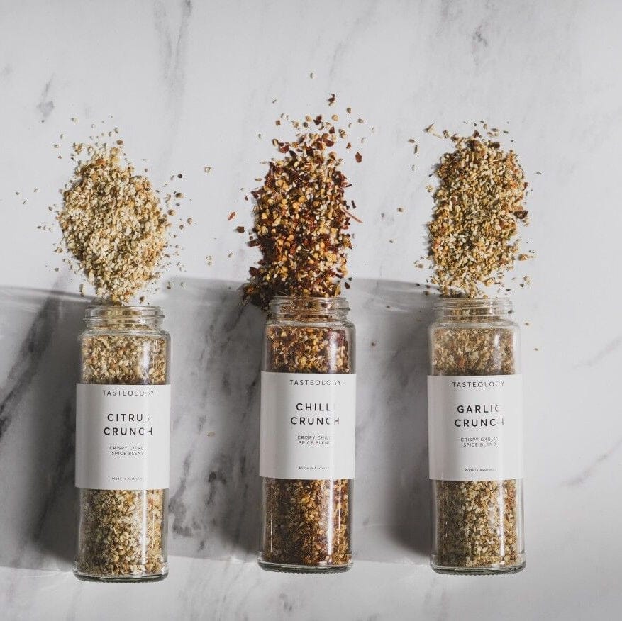 A crunchy, savory, spicy and delicious blend of garlic, herbs and spices. Use as a topper on noodles, stir-fries, pasta, eggs, or grilled meats. Mix with TASTEOLOGY Extra Virgin Olive Oil for a crunchy garlic finishing oil.