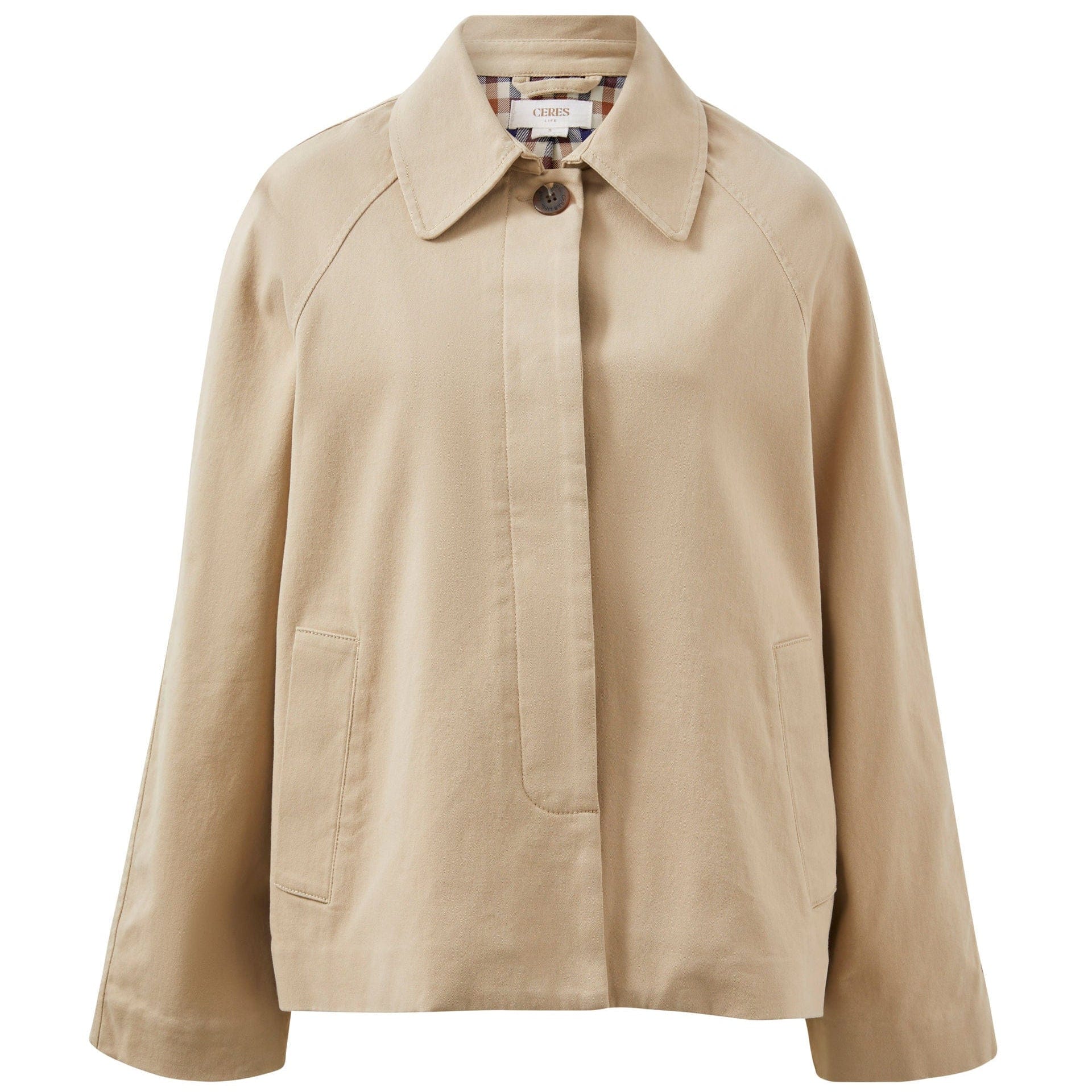 This single-breasted hip length trench, crafted from comfy cotton twill and fully lined with a delightful cotton blend check fabric, features a button-up closure with a concealed placket and front welt pockets. Pair back with denim for a casual chic look.